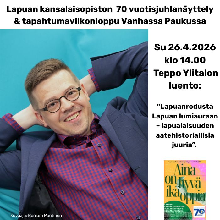 Sunnuntaina 26. huhtikuuta klo 14.00 Lapuan kansalaisopiston 70 vuotisjuhlanäyttelyohjelman kruunaa historioitsija Teppo Ylitalon luento: ”Lapuanrodusta Lapuan lumiauraan – lapualaisuuden aatehistoriallisia juuria”. Luento valottaa kiehtovasti sitä, kuinka aikanaan ”kelvottomina” pidetyistä lapualaisista kasvoi kansallisia esikuvia ja miten vahva paikallisidentiteetti on muovautunut